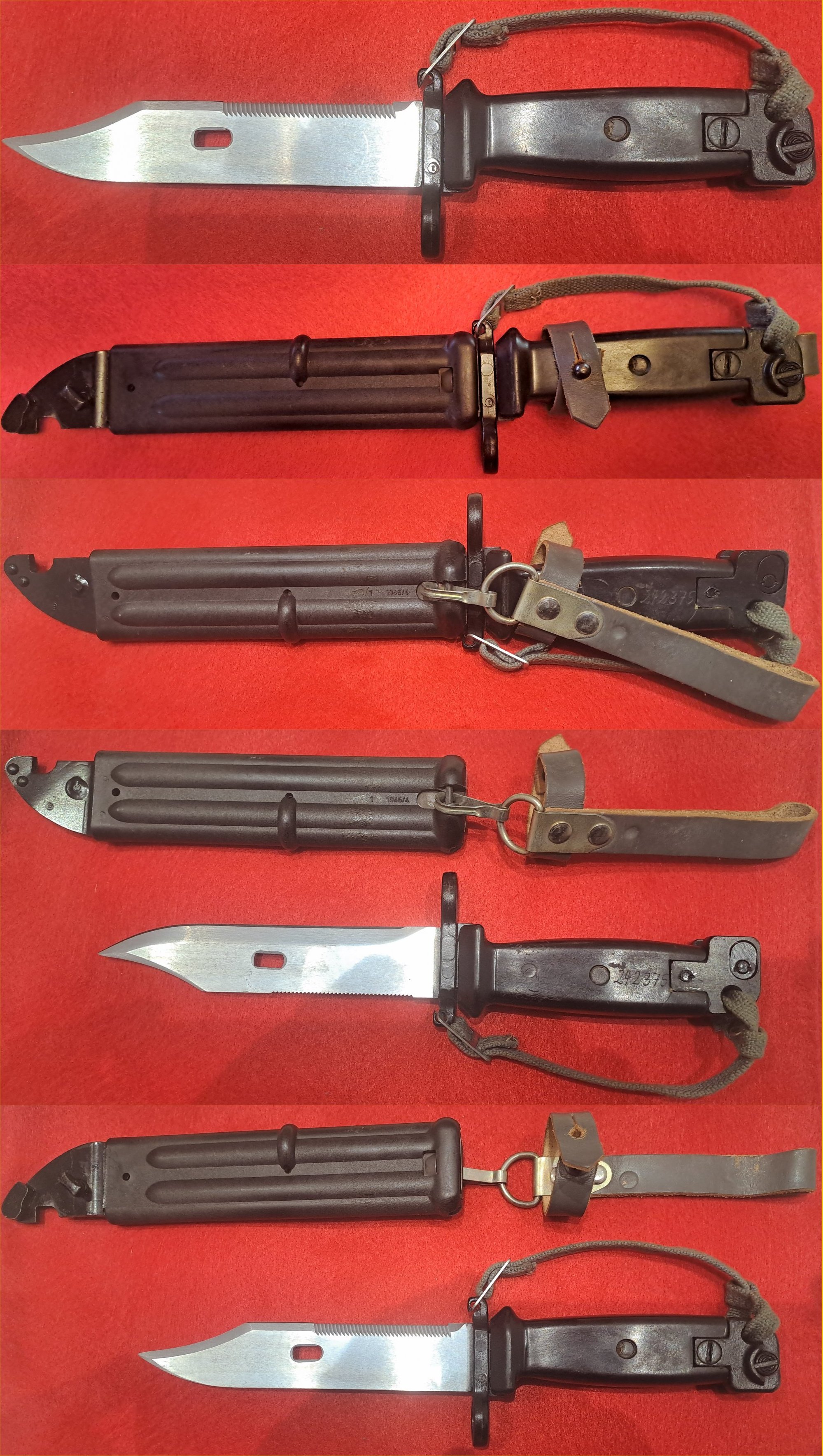 East German made Kalashnikov AKM Type 2 bayonet with scabbard and hanger, designed to fit the Russian Kalashnikov AKM assault rifle.